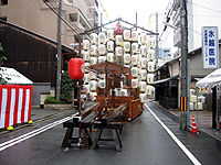 | 鉾を飾る駒形提灯も配されており、鉾の車輪も取り付けられていました。鉾の停泊位置は、路面の礎石の上です。 | ![]() |