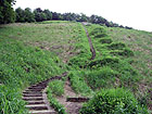 大文字山、火床の大の字を書き順に沿って歩いて見ます。自身、大の字の中心、一と人が交わる部分の金尾(かなわ)から山の斜面を見下ろした時に右(北)側を、画面右に、左(南)側を画面左にレイアウトしてみました。下に降りて上に戻る所まで外側から順番に内側までUの字形の写真配置として見て下さい。ところで余談ですが、長い階段を下って行き、上がって来る時に、足を踏みならすと鶯張りではないですがキュンキュンと音が響く箇所があります。おそらく、階段下に排水用のヒューム管が埋まっていて共鳴するのだと思います。
