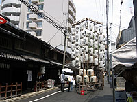 | 芦刈山を過ぎて綾小路通をさらに東に向かいます。すぐに少しだけ幅の広い縦(南北)の通りである西洞院通にたどりつきます。西洞院通を越えて少しだけ東に伯牙山があります。 伯牙山は、京都市指定有形文化財である「杉本家」の横に位置していました。この赤い提灯のある建物も、杉本家の一部と思われます。内部に飾り席が設けてあり、四つの御幣など装飾品が展示されています。 | ![]() |