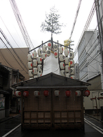 | 新町通仏光寺を下がって岩戸山の山建て場所を見学します。前日から見て、飾り付けも完了した様子です。宵山期間中にちまきを販売するためのテントなども設置を終えています。 | ![]() |