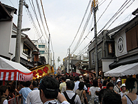 | 蛸薬師通を越えると北観音山の町内なのでしょう。北観音山の駒形提灯も目前に迫ってきました。写真の中の人たちの視線に注目すれば、この先に幾つか見所があることを知ることができます。 | ![]() |
