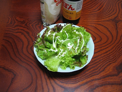 あるときドレッシングを切らしてしまい、冷蔵庫にあった味ぽんをかけてみました。少しもの足りません。そこで、マヨネーズをぐるっとかけてみました。すると、結構いけます。おいしいです。