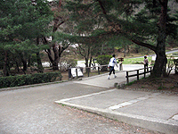 | 梅林園の前を通って宝が池に沿った道まできました。ここから、さらに東に進みます。道幅は広く、明るい道です。宝が池の周回コースは舗装されていないのでジョギングコースとして多くの市民に親しまれています。 | ![]() |