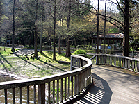 | 水際の地面から木製の見晴し場に上がることもできます。地形に沿ってうまく設けられた野鳥の森周辺は、とても静かな場所となっており、一定の整備もされているようです。山側に入るとたぶん野鳥がいるのでしょう。 | ![]() |